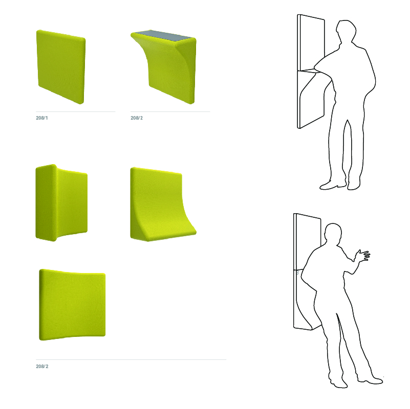Landingの形状は2種類。カーブのついた208/2は、取り付け方によって寄りかかるための「止まり木」にも、コーヒーテーブルにも、開放感を保ちつつプライバシーを守る壁としても機能します。