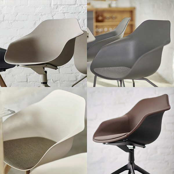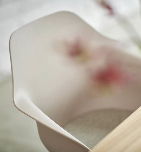 バイオコンポジット・プラスチック製のシートシェルは、クリームホワイト・グレー・ベージュ・シエナレッド・エメラルドグリーン・ブラックの6色展開。ホワイト系カラーとして、他シリーズのプラスチックシェルで採用されているピュアホワイトではなく、よりナチュラルなクリームホワイトが選ばれています。ウィルクハーンが提案するインテリアのための4つのカラーボード(Mood Boards)を表現するのに最適なバリエーションです。